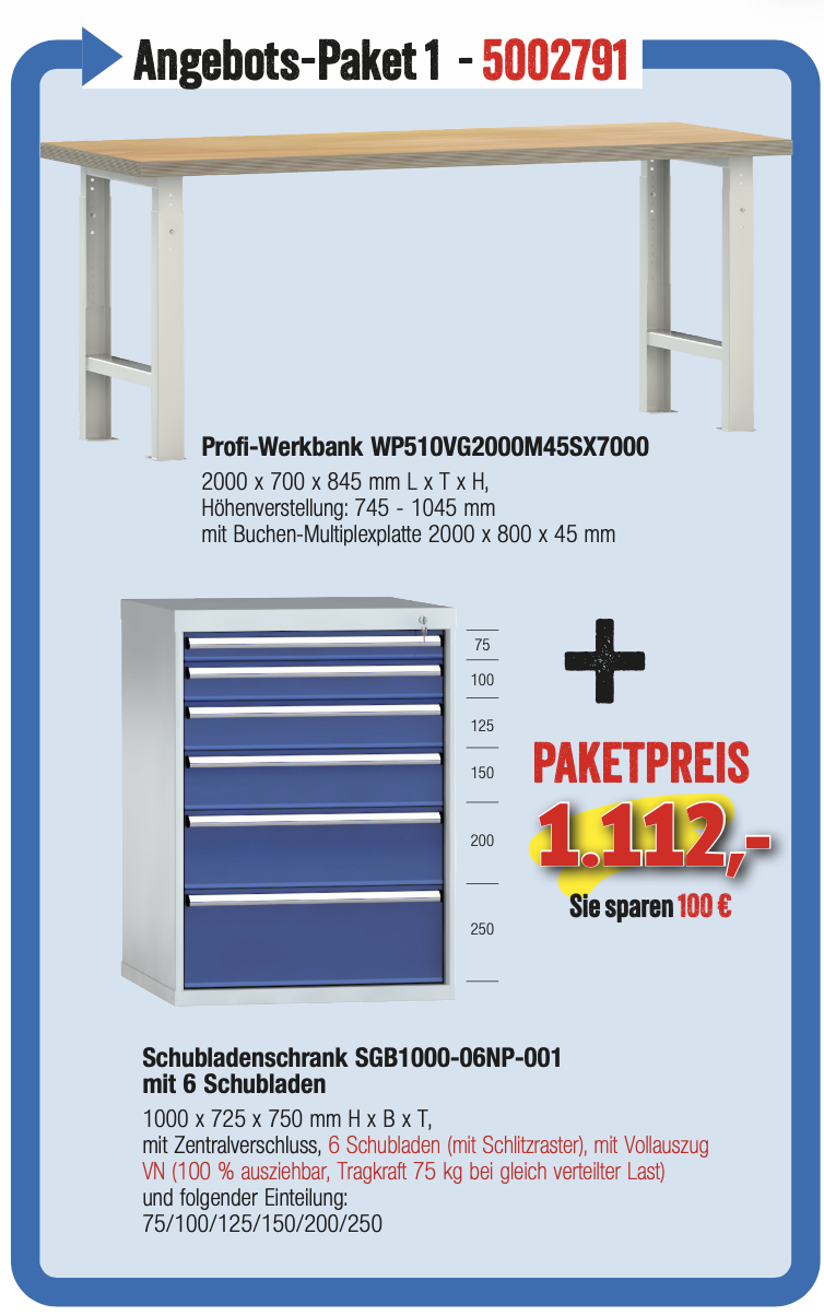Aktions-Paket 1 mit Profi-Werkbank 2000 mm und Schubladenschrank 6 Vollauszüge